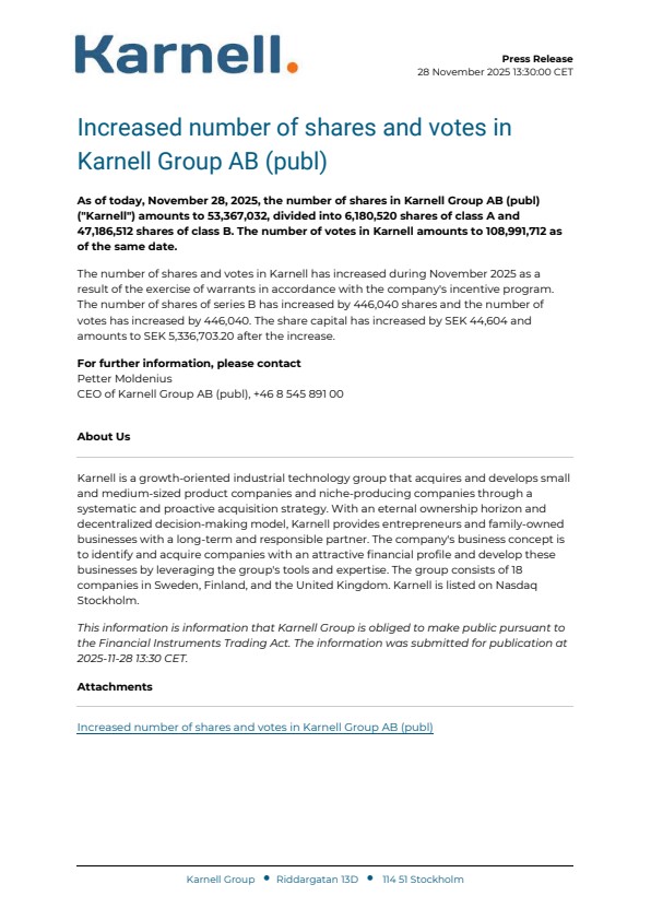 As of today, November 28, 2025, the number of shares in Karnell Group AB (publ) ("Karnell") amounts to 53,367,032, divided into 6,180,520 shares of class A and 47,186,512 shares of class B. The number of votes in Karnell amounts to 108,991,712 as of the same date.
