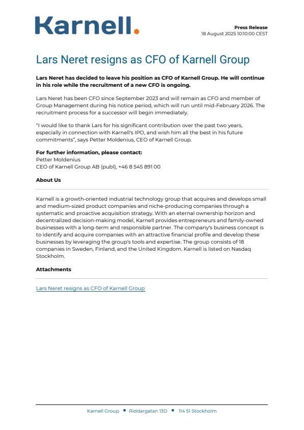 Lars Neret has decided to leave his position as CFO of Karnell Group. He will continue in his role while the recruitment of a new CFO is ongoing.