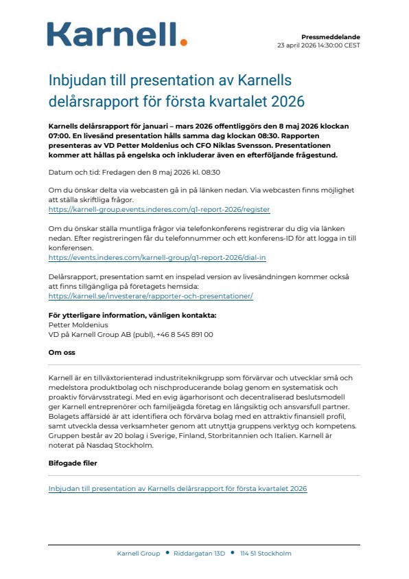 Karnells delårsrapport för januari – mars 2026 offentliggörs den 8 maj 2026 klockan 07:00. En livesänd presentation hålls samma dag klockan 08:30. Rapporten presenteras av VD Petter Moldenius och CFO Niklas Svensson. Presentationen kommer att hållas på engelska och inkluderar även en efterföljande frågestund.